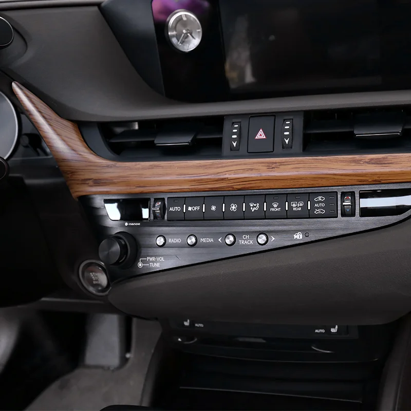 Product Name: QHCP لوحة سيارة لوحة القيادة قطاع مركز وحدة التحكم الزخارف ملصقات ABS الخشب الحبوب ألياف الكربون الأسود 2 قطعة لكزس ES200 260 300H 2018